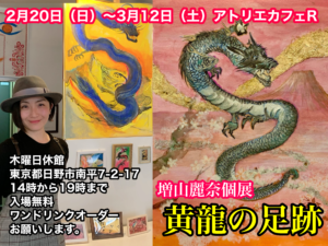 東京都日野市南平に昨年末にオープンした「アトリエカフェR」。カフェ・映画館・収録スタジオ、ワークショップなど多様な芸術を生み出す場として皆様のご好評をいただいておりますが、この度、増山麗奈が画家人生の足跡をたどる個展イベント「黄龍の足跡」を開催することとなりました。2月20日~3月12日の日程で、開催期間毎日18時頃からは増山麗奈が描いた絵画についいての紹介トークも行う予定です。