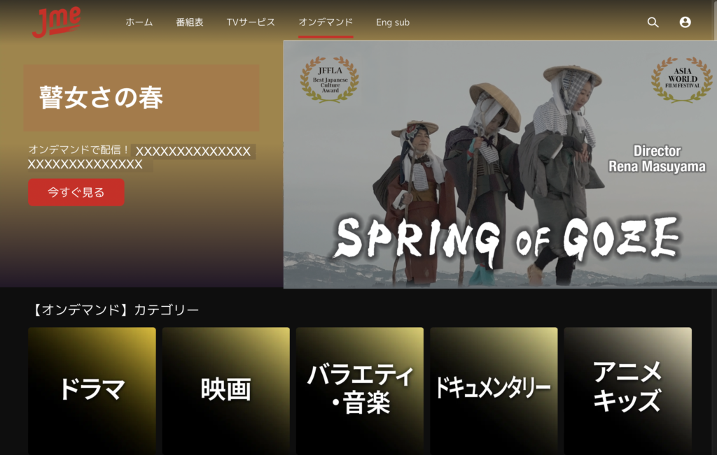 私たち一般社団法人ユーラシア国際映画祭が製作した映画「瞽女さの春」がアメリカとカナダで配給されている日本コンテンツ配給サブスク「JME」にて配信が始まりました。